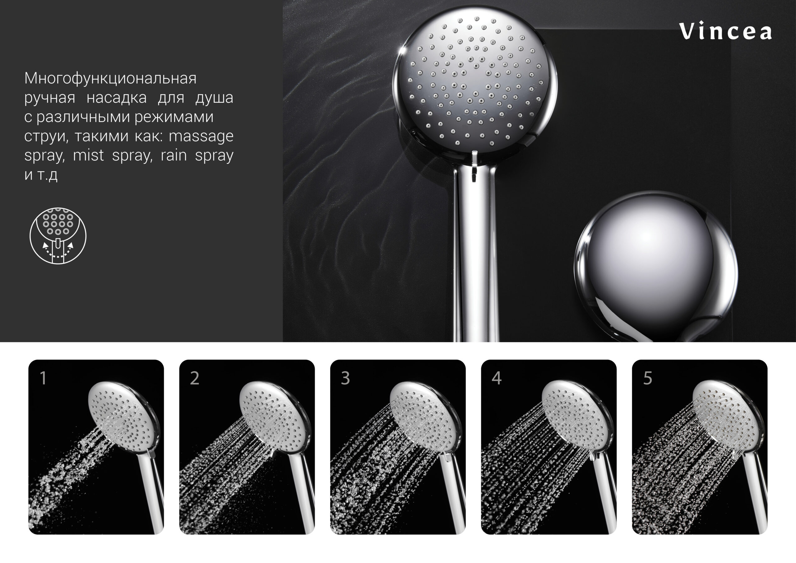 Комплектуется термостатическим картриджем Vernet. Пятифункциональный ручной душ. Верхний душ из нержавеющей стали.