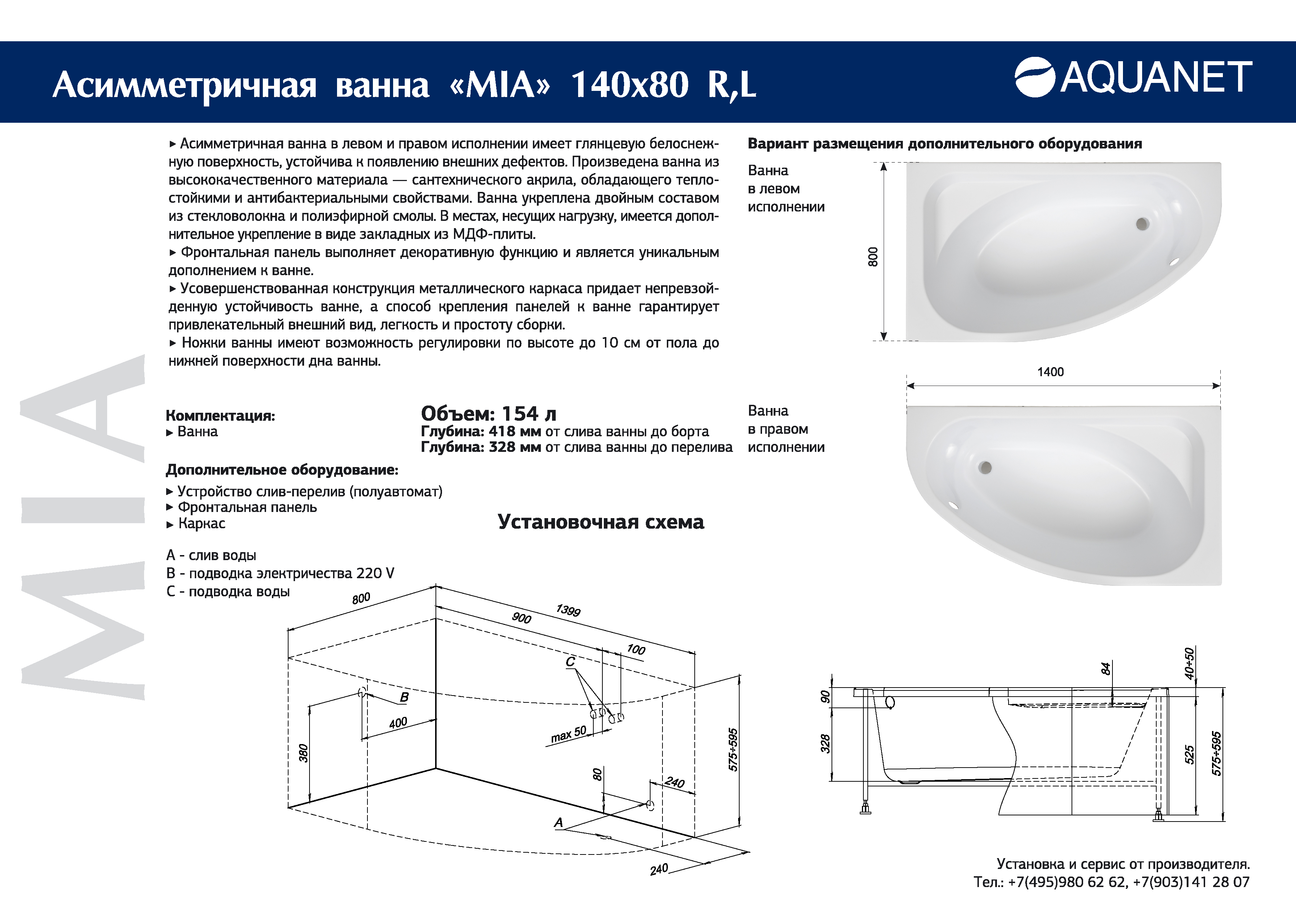 Фронтально-боковая панель Aquanet Mia 140х80 L/R